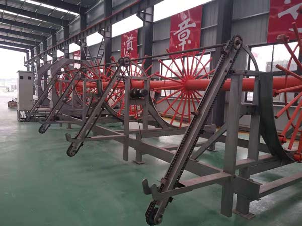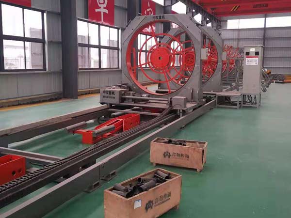根據(jù)施工要求,先將主筋穿過固定轉盤中相應模板的導管穿至移動轉盤的相應套管中,進行固定。把繞筋端頭先焊接在一根主筋上。然后通過固定轉盤及移動轉盤轉動,把繞筋纏繞在主筋(移動盤是一邊旋轉一邊前進),同時進行焊接,直至焊到主筋末端規(guī)定位置,即形成產(chǎn)品鋼筋籠。